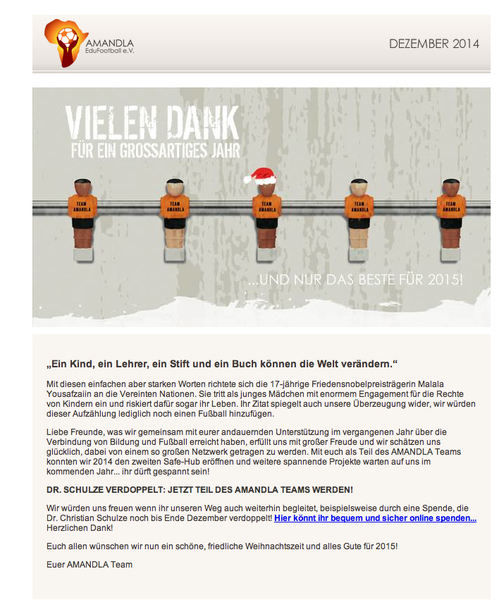 In December 2014 we gave the members of our groups the opportunity to say thank you by donating to Amandla, an organisation built to drive social change for kids and young people in South Africa. As the winner of the Soccer World Cup in 2014, we encouraged our German members to “Donate like a World Champion”.